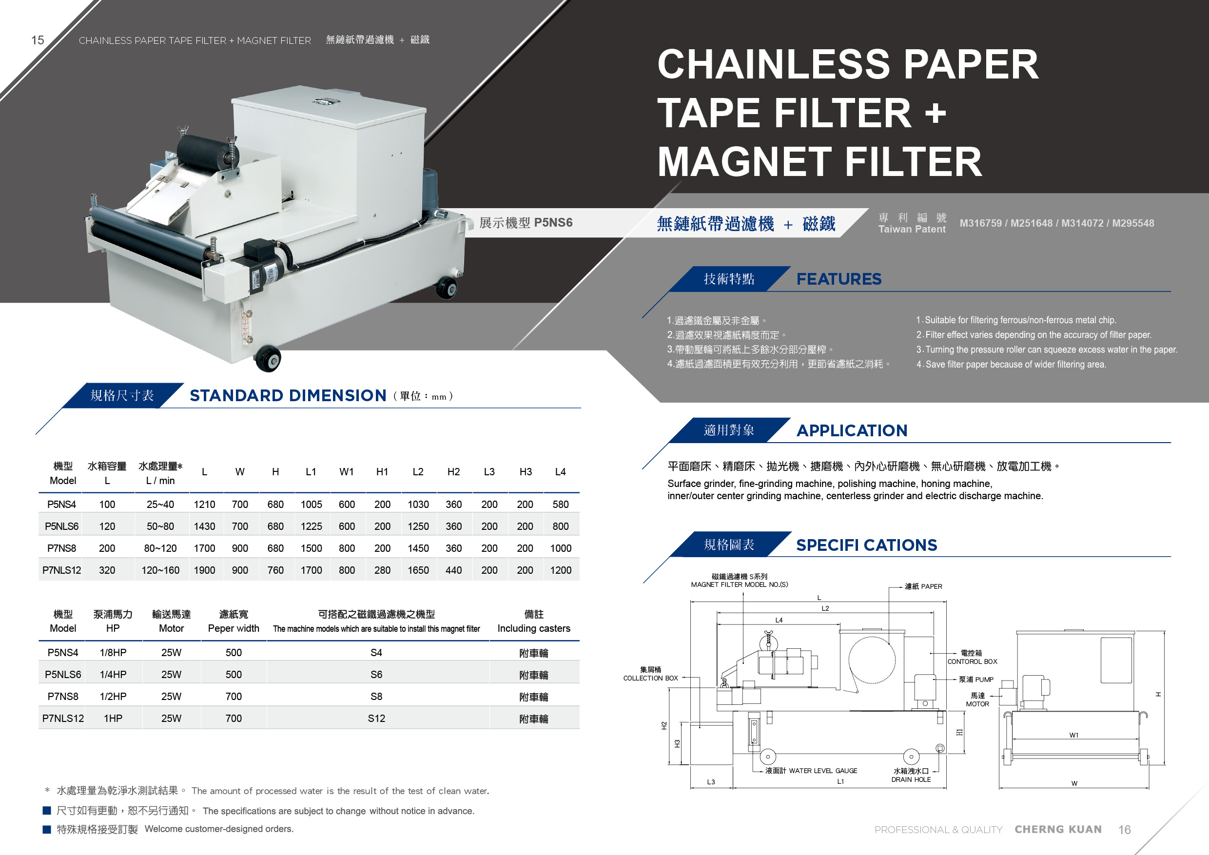 | 機型 | 泵浦馬力 | 輸送馬達 | 濾紙寬 | 可搭配之磁鐵過濾機之機型 | 備註 | ||||||||