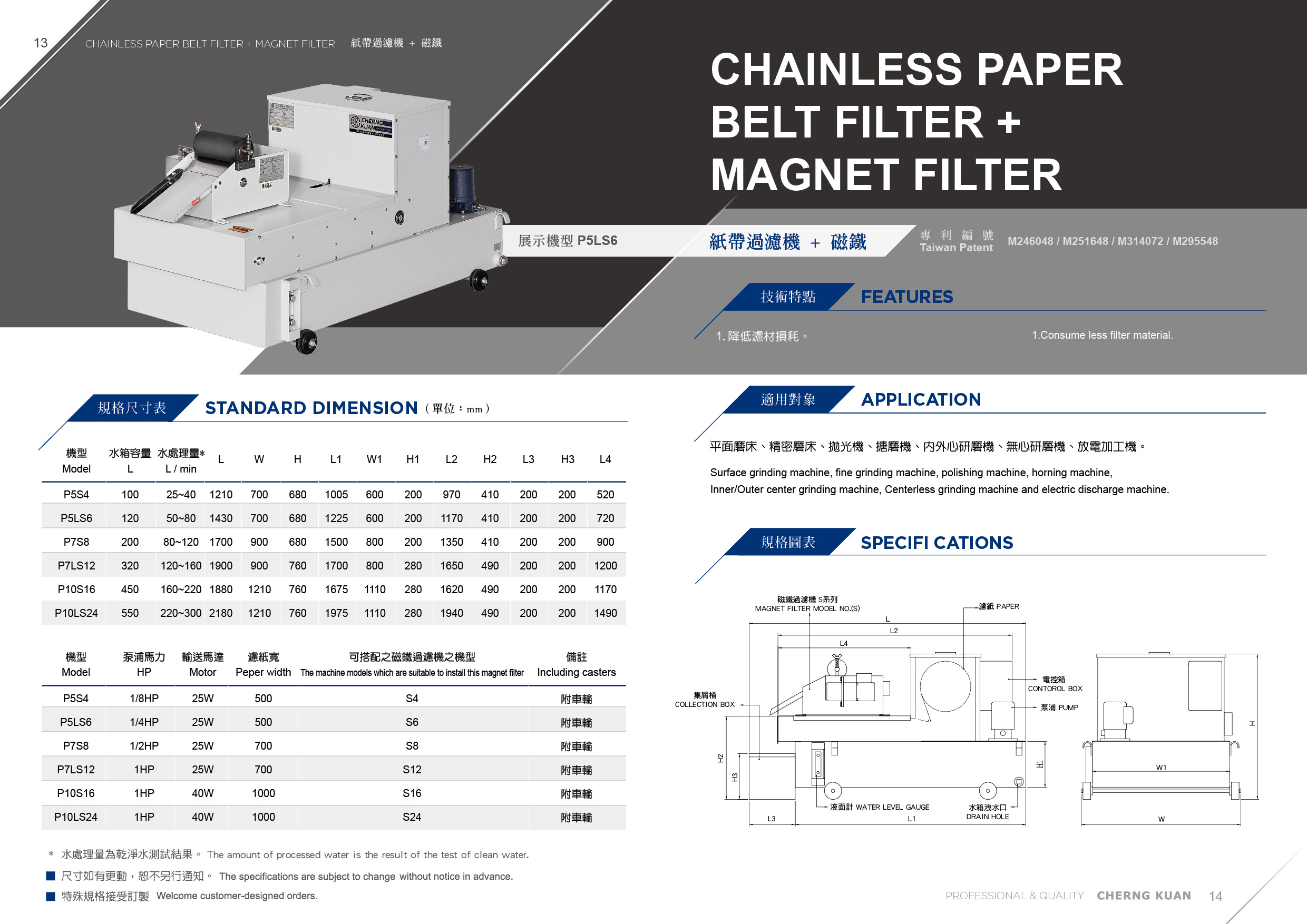 | 機型 | 泵浦馬力 | 輸送馬達 | 濾紙寬 | 可搭配之磁鐵過濾機之機型 | 備註 | ||||||||
